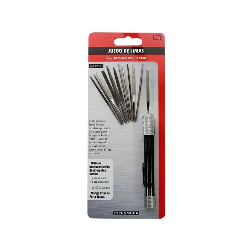 Contiene: 5 limas de acero, 5 limas diamantadas y 1 mango porta limas.