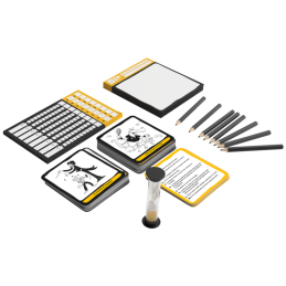 Contenido: 200 cartas de Obra de arte, 8 lápices, 1 cuadernillo de dibujo, 1 cuadernillo de marcadores de puntuación, 1 reloj de arena de 90 segundos