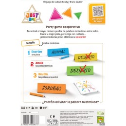 Just One es un juego cooperativo de adivinanzas para entre 4 y 7 jugadores. Vuestra misión es averiguar cuantas más palabras secretas mejor, antes de que se acaben las cartas del mazo. Un divertido juego perfecto para toda la familia y que supone una manera divertida de mejorar habilidades como la deducción lógica y herramientas como el vocabulario, la capacidad de expresión y la síntesis. Buscad la mejor pista para ayudar todo lo posible a vuestro compañero y sed originales, ¡porque las pistas idénticas quedarán anuladas!