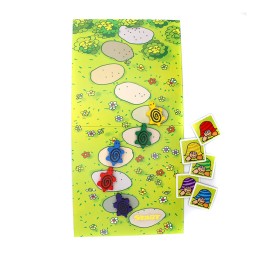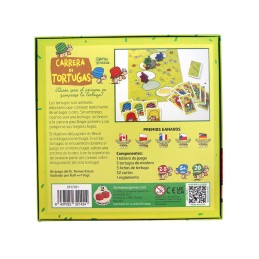 Contenido: 1 tablero de juego, 5 tortugas de madera, 5 fichas de tortuga, 52 cartas y 1 reglamento.