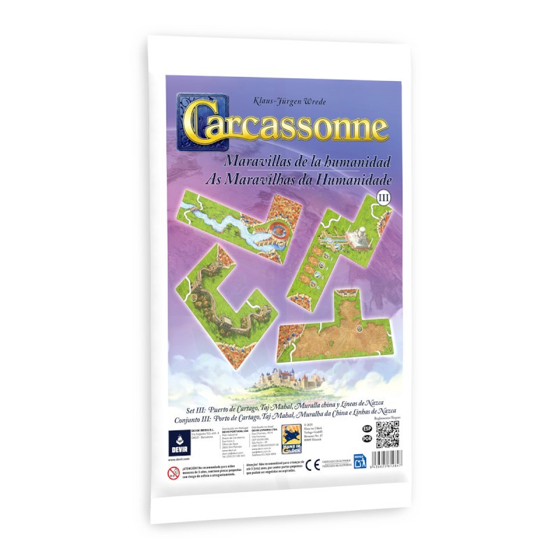 Esta pequeña expansión para Carcassonne añade 4 losetas que representan varias maravillas de la humanidad: la Gran Muralla china, las líneas de Nazca, el puerto de Cartago y el Taj Mahal.
