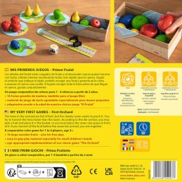 Contenido: 1 cuervo, 1 cesta de la fruta, 4 manzanas verdes, 4 manzanas rojas, 4 peras amarillas, 4 ciruelas azules, 5 cartitas-camino, 4 árboles, 1 dado de símbolos y colores, Instrucciones del juego.